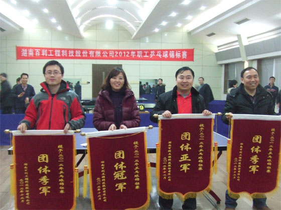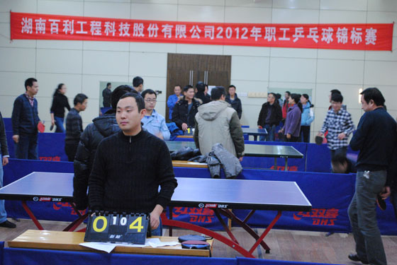 為豐富員工的業(yè)余生活,增強(qiáng)身體素質(zhì),培養(yǎng)團(tuán)結(jié)合作精神,在公司領(lǐng)導(dǎo)及工會的大力支持和土建室分會的精心組織安排下,2012年12月17日舉辦了“2012年湖南百利工程科技股份有限公司乒乓球錦標(biāo)賽”。經(jīng)過近兩周緊鑼密鼓的比賽,于12月26日圓滿落下了帷幕,本次乒乓球比賽為員工提供了相互交流、切磋球技的機(jī)會,同時為員工在辛勤工作的間隙提供了一個勞逸結(jié)合、強(qiáng)身健體的機(jī)會。