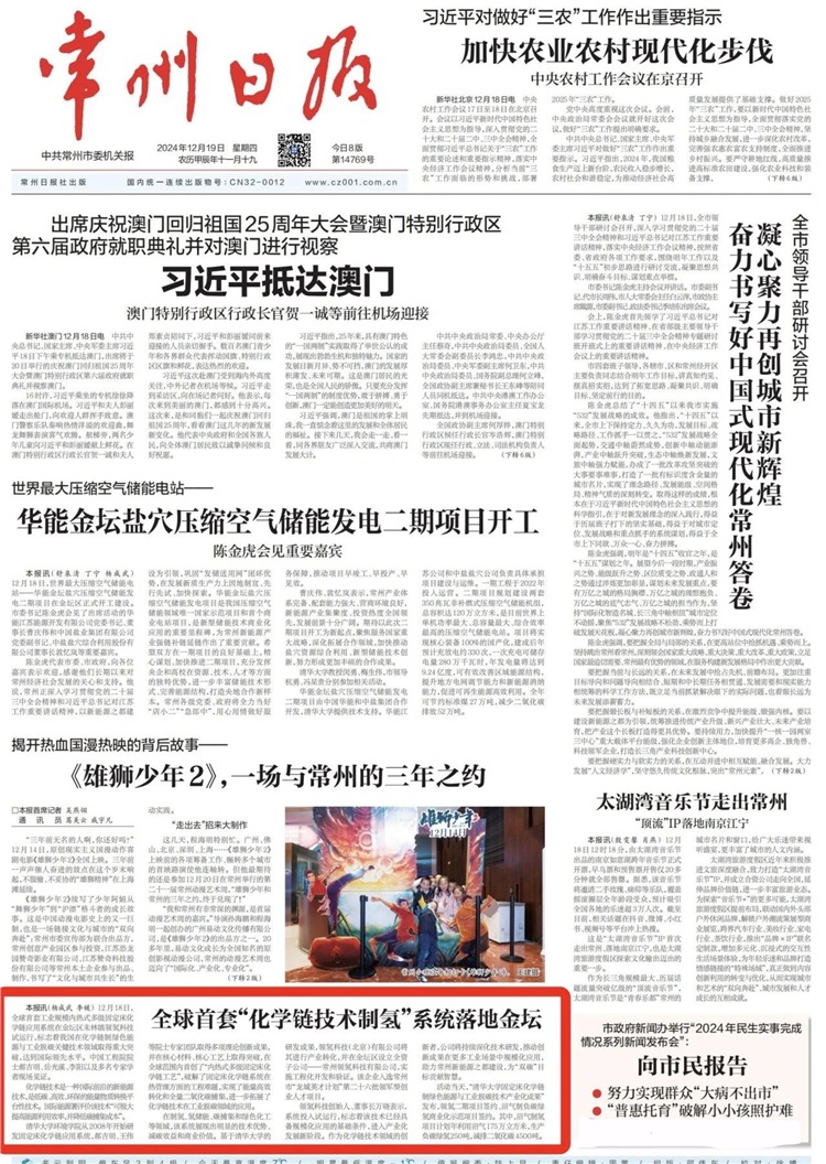 2024年12月18日,全球首套工業(yè)規(guī)模內(nèi)熱式多級固定床化學(xué)鏈應(yīng)用系統(tǒng)在常州領(lǐng)氫科技試運行,這標(biāo)志著我國在化學(xué)鏈制綠色能源與工業(yè)脫碳關(guān)鍵技術(shù)領(lǐng)域取得重大突破,達(dá)到國際領(lǐng)先水平。中國工程院院士郝吉明、岳光溪、李陽以及多名教授專家學(xué)者及知名企業(yè)家現(xiàn)場見證。《常州日報》更是在頭版刊發(fā)要聞《全球首套“化學(xué)鏈制氫”系統(tǒng)落地金壇》,報道領(lǐng)氫科技全球首套“工業(yè)規(guī)模內(nèi)熱式多級固定床化學(xué)鏈應(yīng)用系統(tǒng)”啟動試運行。