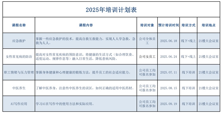 值得一提的是,6月的培訓計劃只是百利鋰電全年安全健康培訓體系的一部分。從應急救護到女性常見病的防治,從職工情緒與壓力管理到中醫(yī)養(yǎng)生,再到AI寫作應用等,公司的培訓內(nèi)容涵蓋多個領域,并通過線下與線上相結合、理論講解與實踐操作相結合的方式,旨在滿足員工多樣化的需求,讓員工真正學有所獲、學以致用。