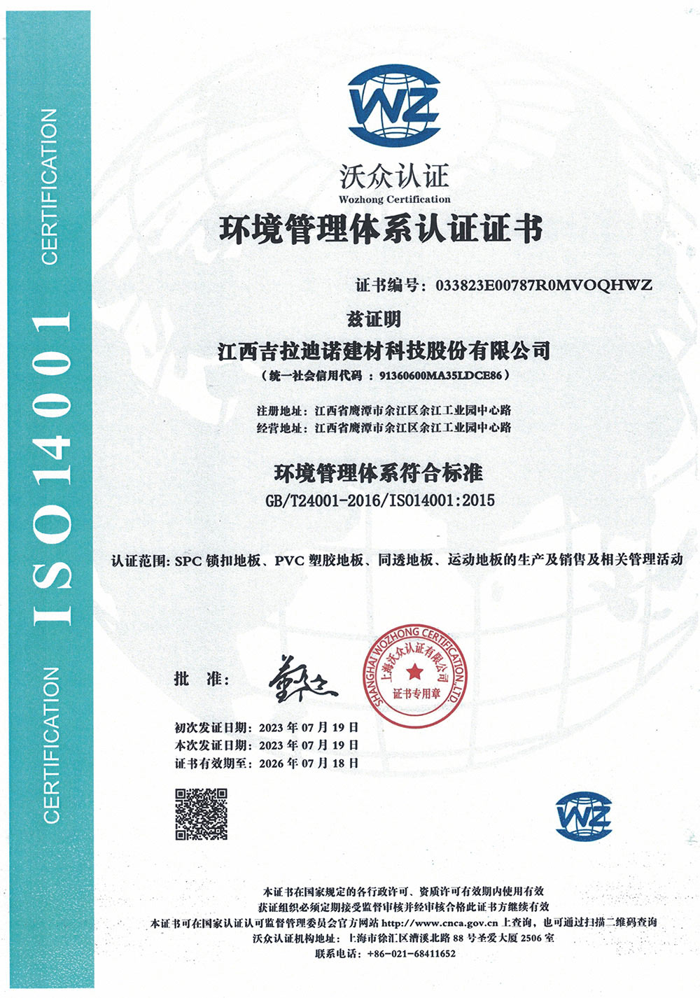 環(huán)境管理體系認(rèn)證證書
