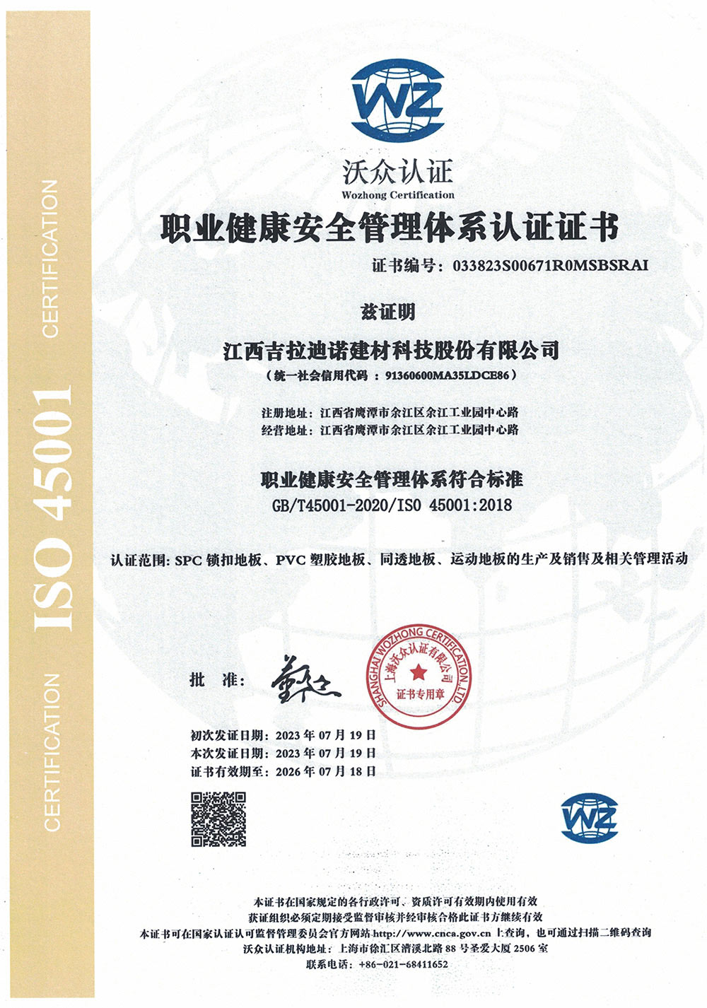 職業(yè)健康安全管理體系認(rèn)證證書
